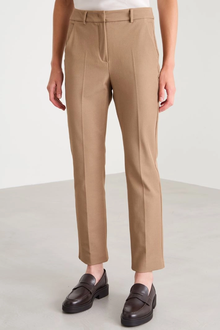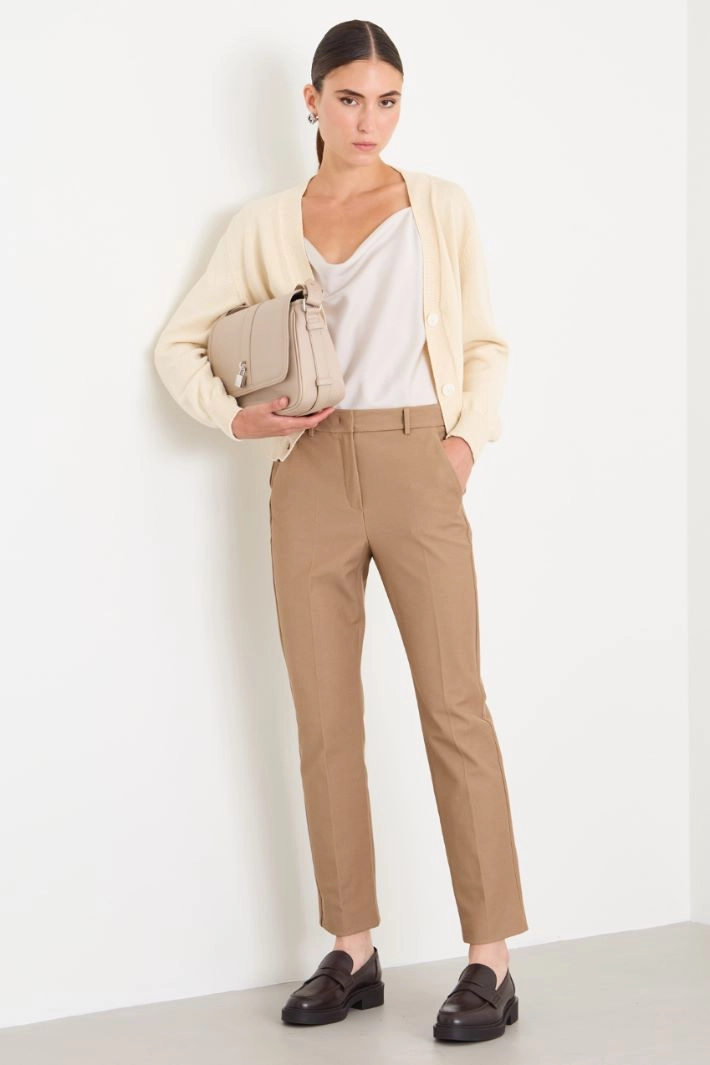 Chino trousers in double stretch cotton blend canvas, with waistband and belt loops, French pockets on the front and double welt pockets with button on the back, pressed crease. Hidden fastening with zip, button and hook.