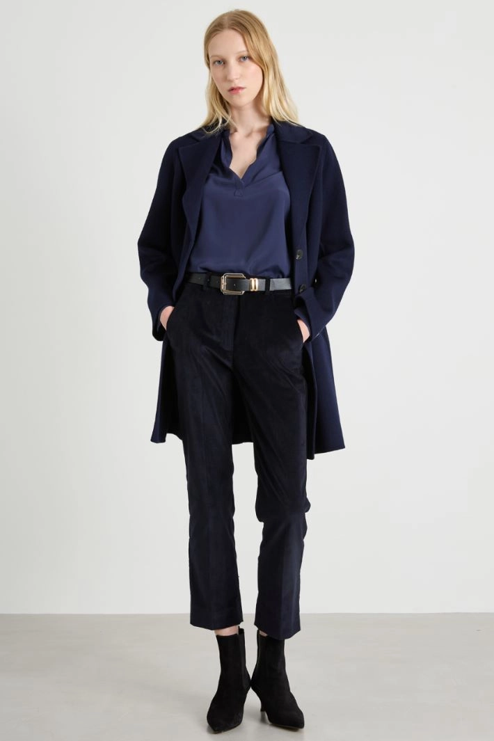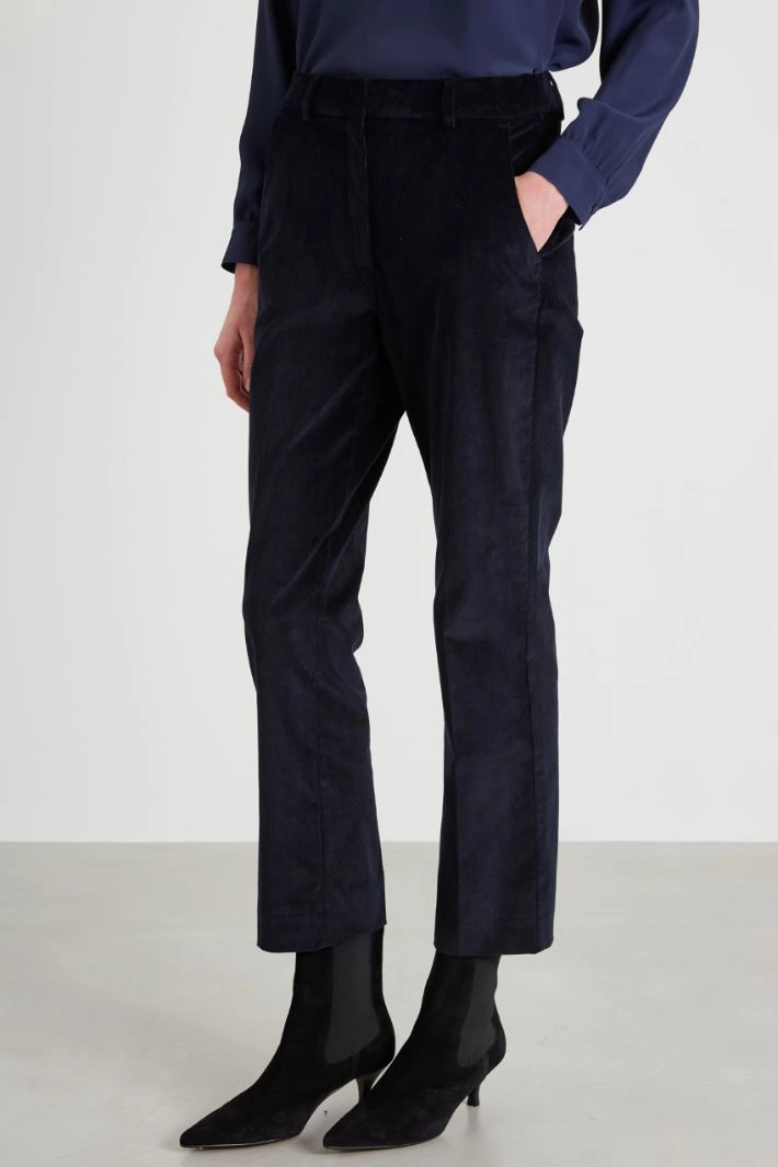 Cigarette trousers in stretch cotton corduroy, with belt loops at the waist, side French pockets and double welt pockets with button on the back, pressed crease lengthwise. Hidden fastening with zip, button and hook.