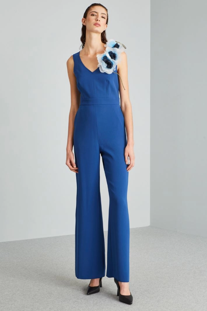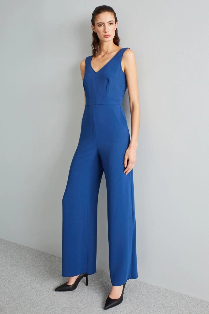 Semi-fitted sleeveless cady jumpsuit with V-neck front and back, thick straps, belt at the waist and French pockets on the front. Invisible zip fastening on the back. Lined.