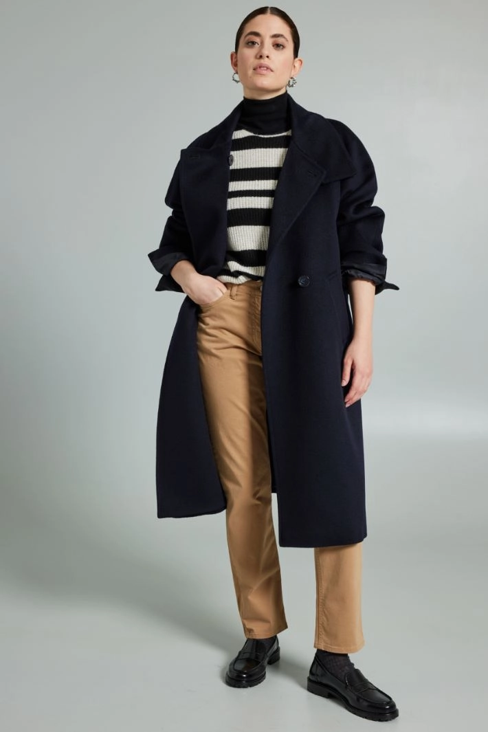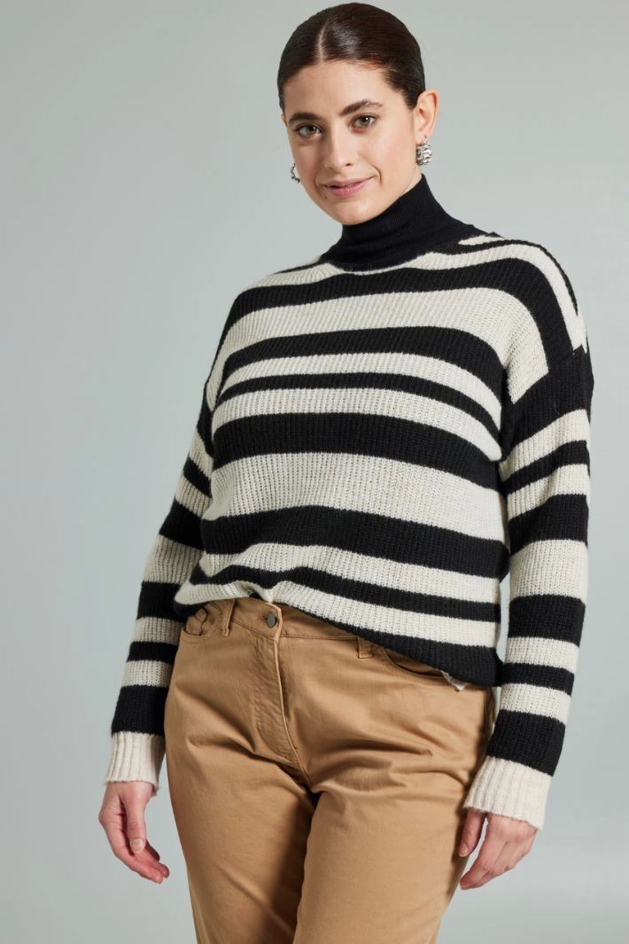 Straight-fit sweater in yarn-dyed viscose and wool blend yarn, with boat neckline, long sleeves with dropped shoulders, small side slits at the hem and ribbed trims.