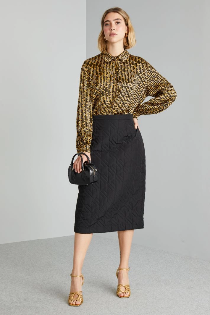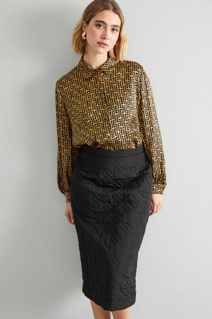 Fluid shirt in printed pure viscose satin, with classic collar, long sleeves with cuff and button, side slits at the hem and fastening with fabric-covered buttons on the front.
