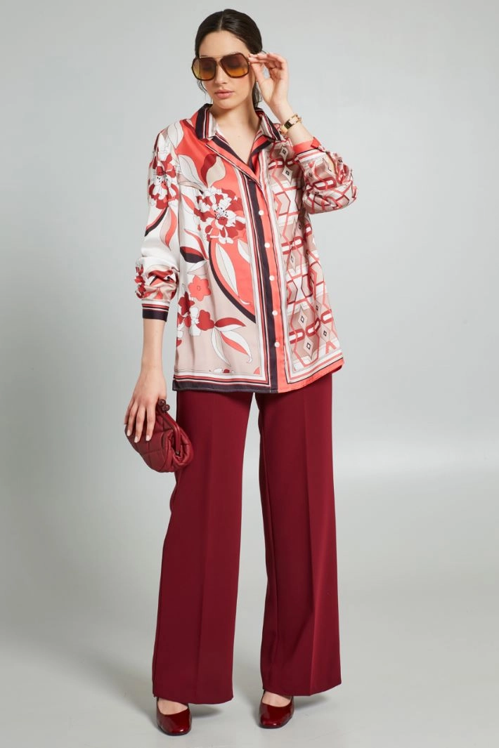 Palazzo trousers in stretch canvas, with waistband and pleats on the front and back. Fastening with zip and side button.