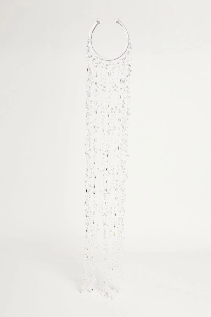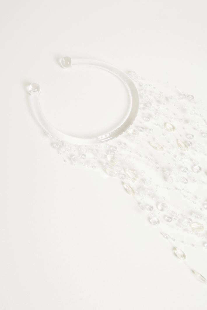 Rigid collar in transparent resin, featuring long fringes with transparent teardrops.
