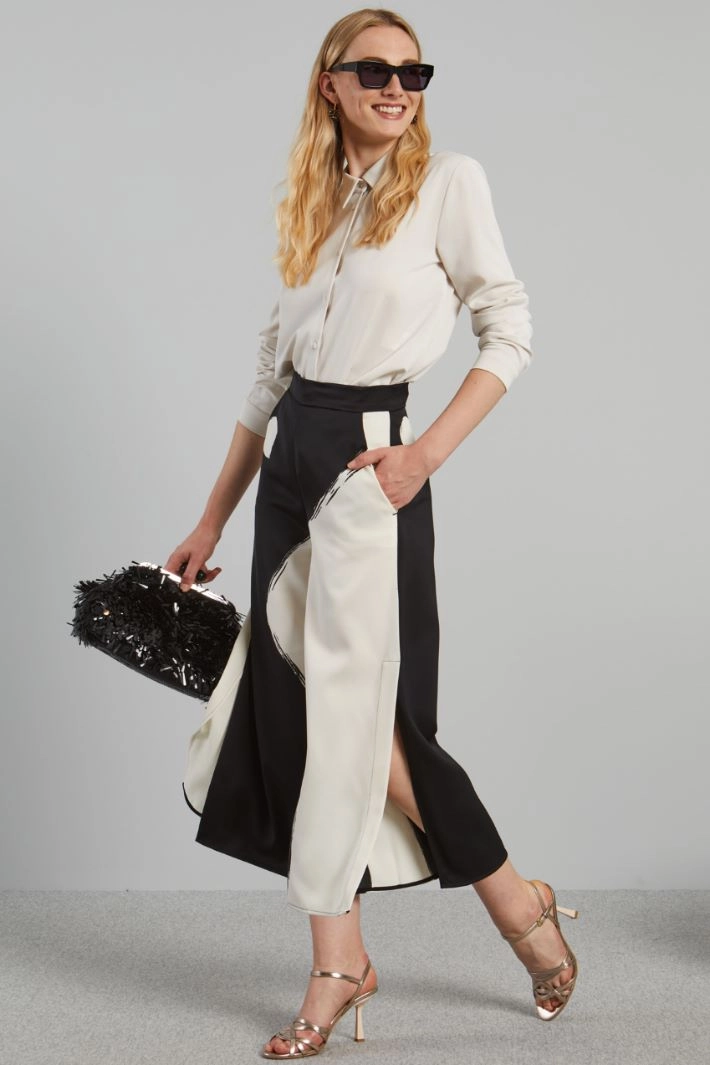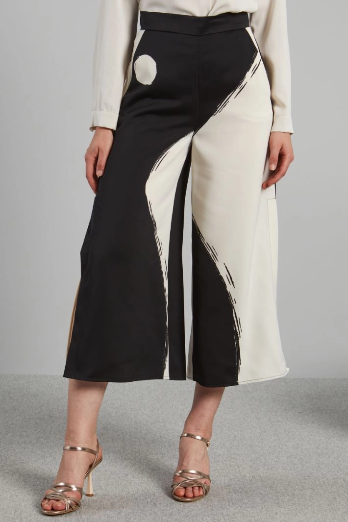 Wide-cut cropped trousers in shiny printed envers satin, with side slant pockets, large side vents and invisible zip and hook fastening on the back.