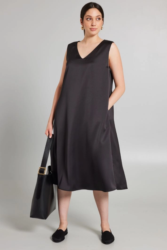 Fluid satin dress with V-neck, sleeveless and inset side pockets.