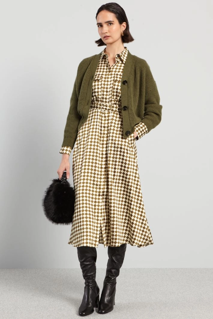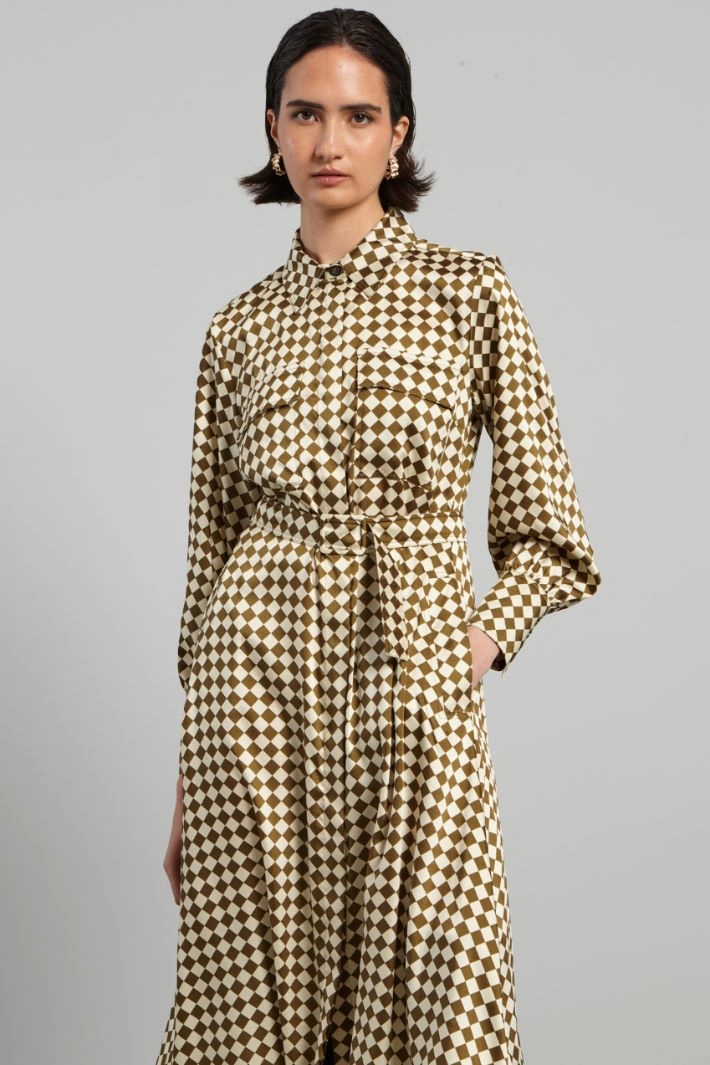 Shirt dress in printed twill, with classic collar, long sleeves with cuff and button, patch pockets with flap on the chest and inset side pockets and hidden fastening with buttons. Matching sash.