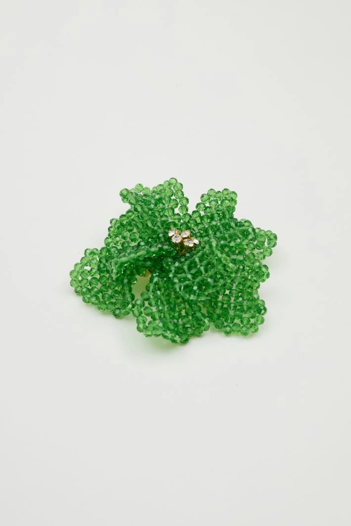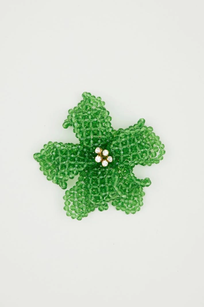 Flower-shaped brooch, embellished with embroidery featuring coloured beads and a central crystal.
