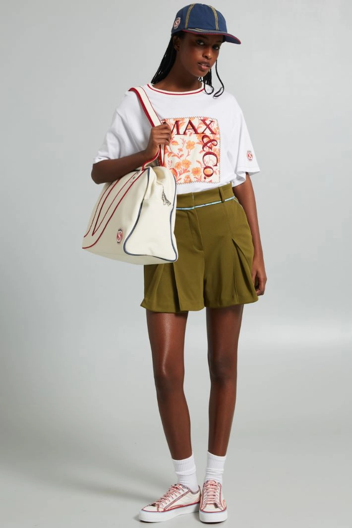 Loose-fitting shorts in stretch pique jersey, with waistband and belt loops, French pockets, front pleats and contrasting piping detail. Hidden zip and button fastening.