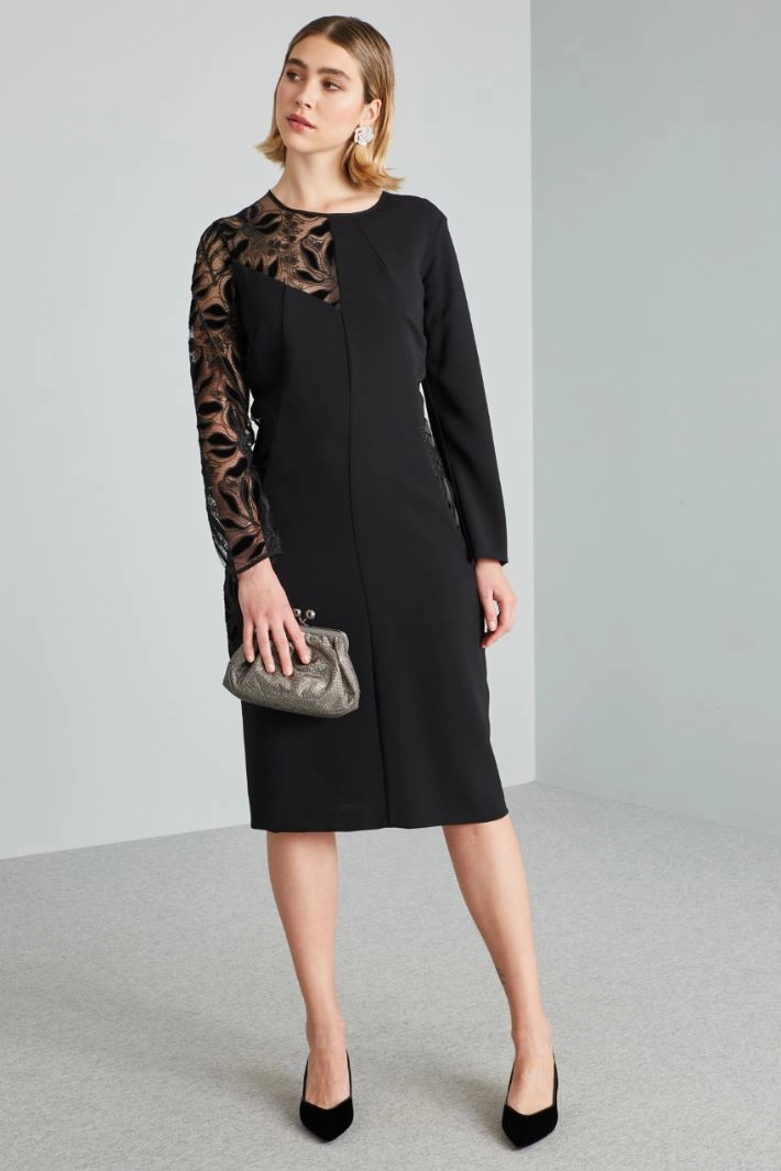 Cady sheath dress with matching lace inserts, crew neck, long sleeves, central slit in the back and invisible zip fastening in the back. Partially-lined.