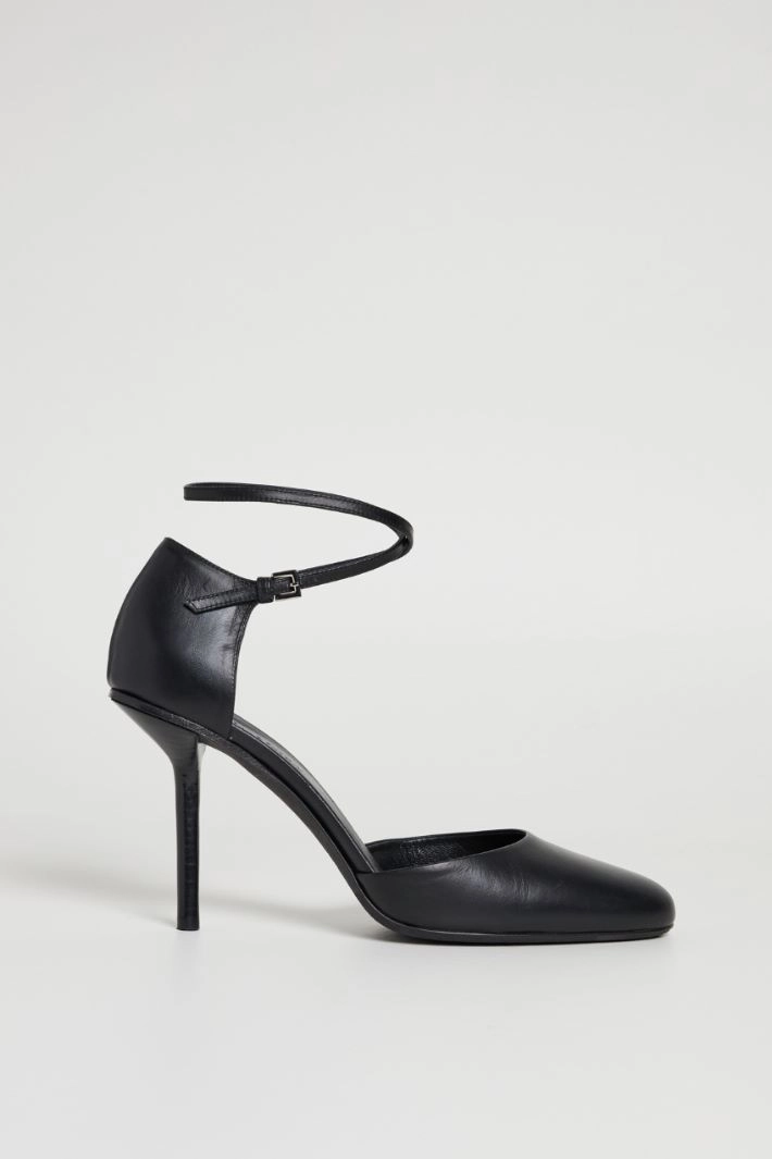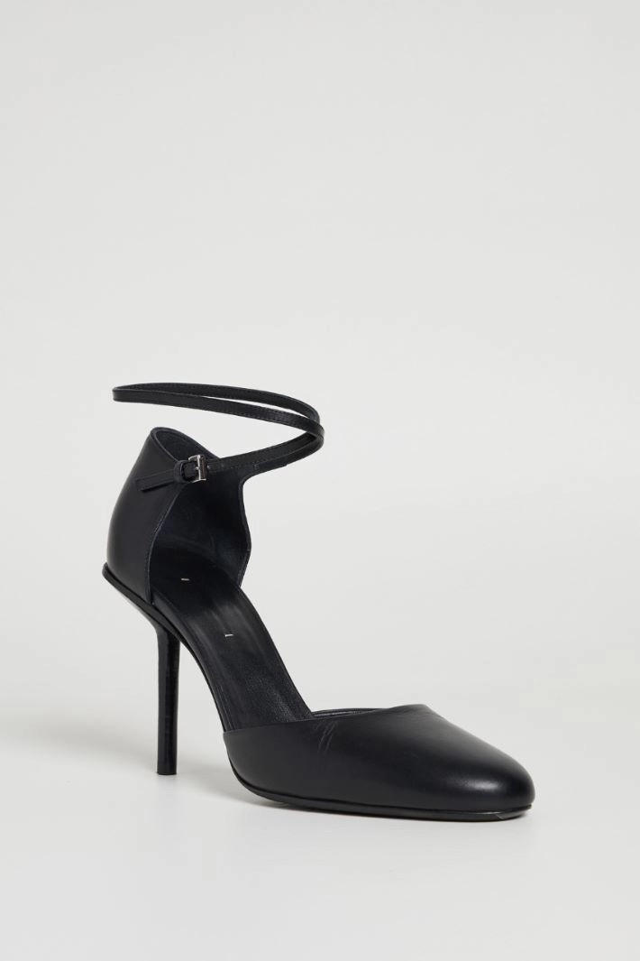 Genuine leather sandals with a semi-gloss finish, with a crossed ankle strap adjustable with a buckle. Rounded toe and thin leather heel. Leather lining, leather sole.