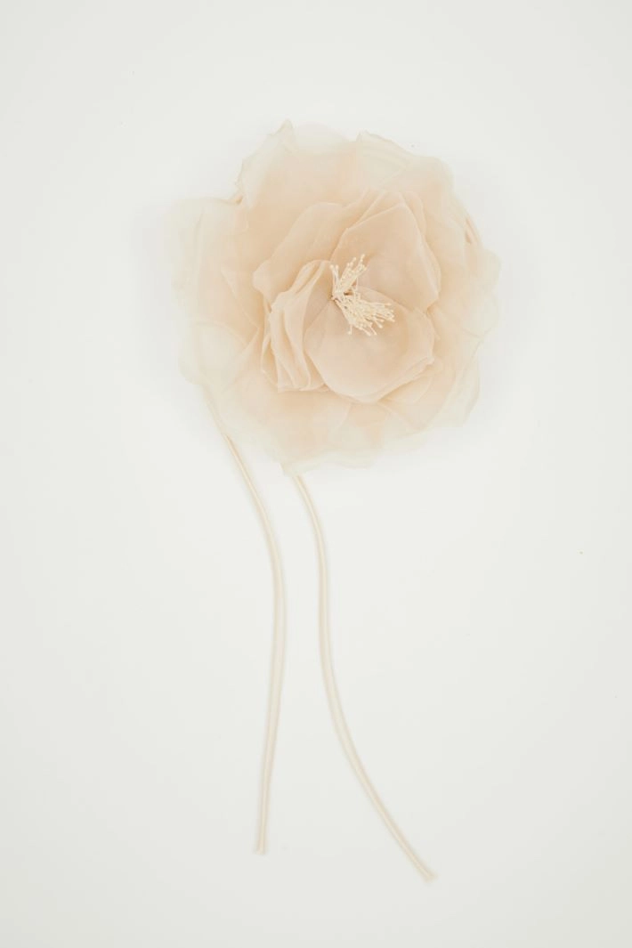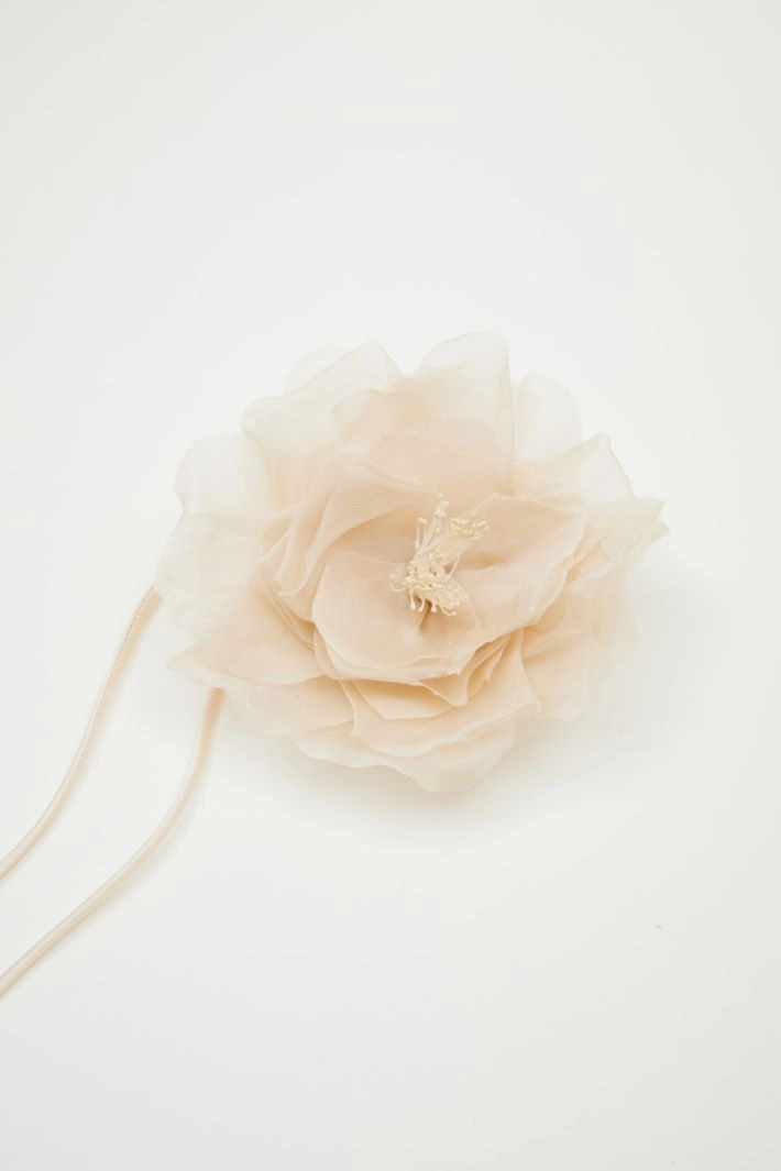 Flower-shaped brooch crafted in pure silk, featuring long ties that can also be styled around the waist. Metal fastening.