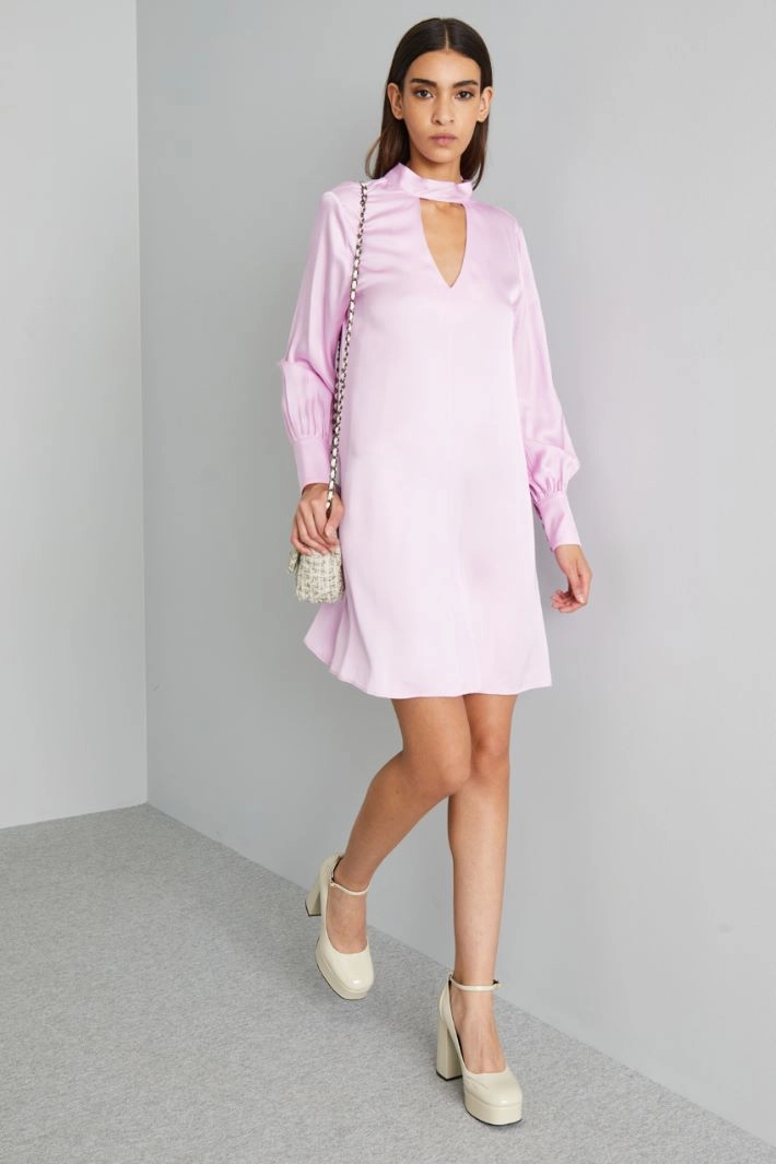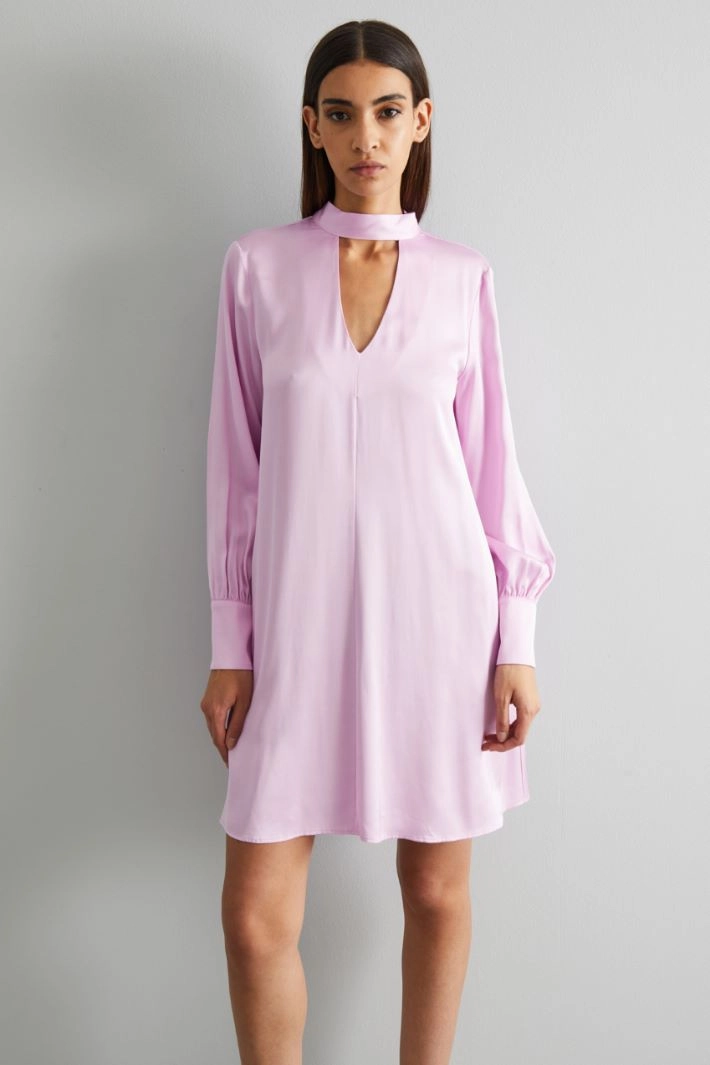Short flared satin dress. V-detail and tie-embellished band collar. Loose-fitting long sleeves, complete with long cuffs.