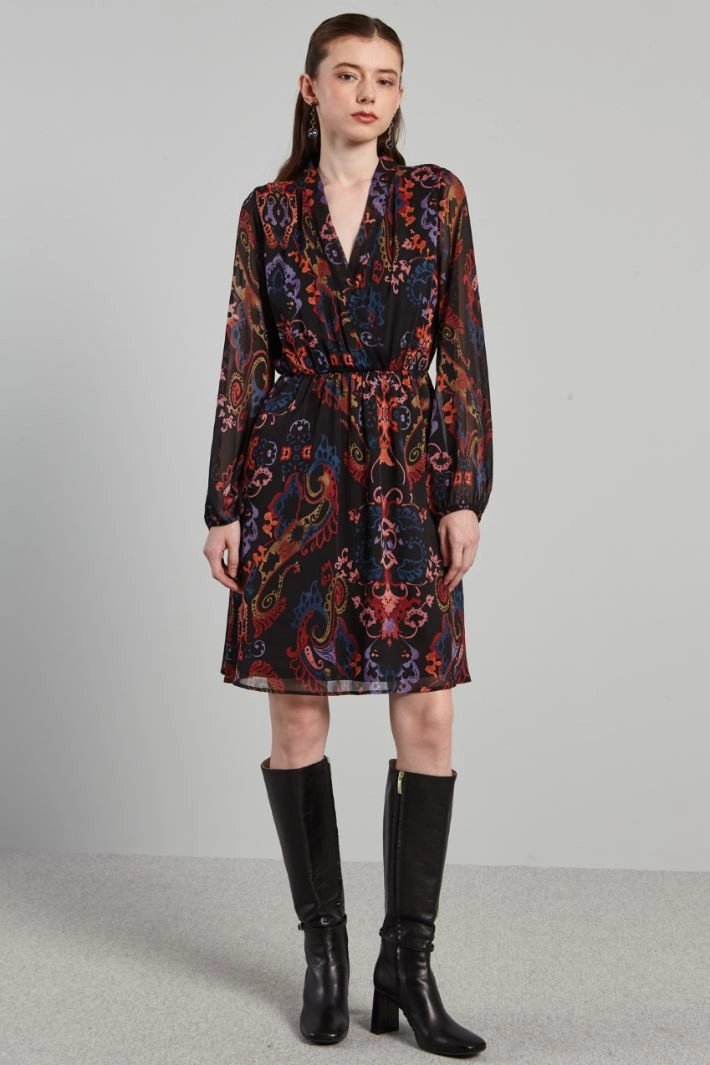 Relaxed-fit crepon dress featuring an elasticated waist. Crossover V-neckline and elasticated cuff-embellished loose-fitting long sleeves. Lined model