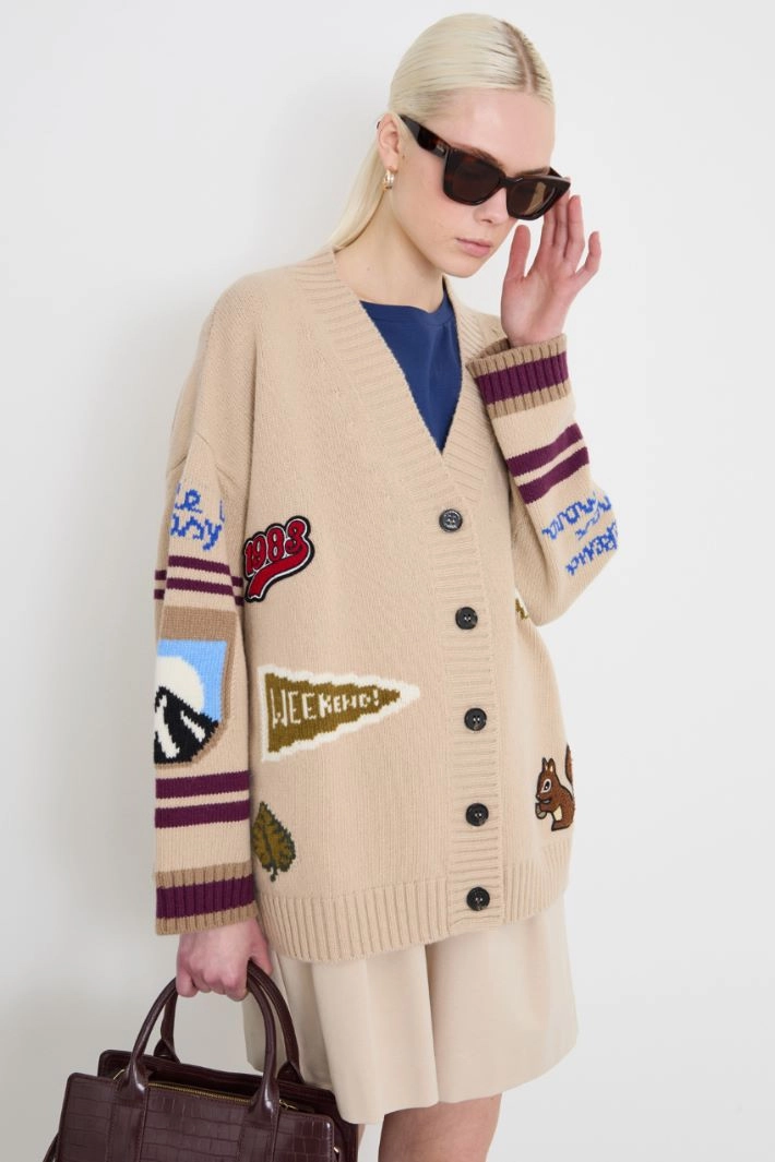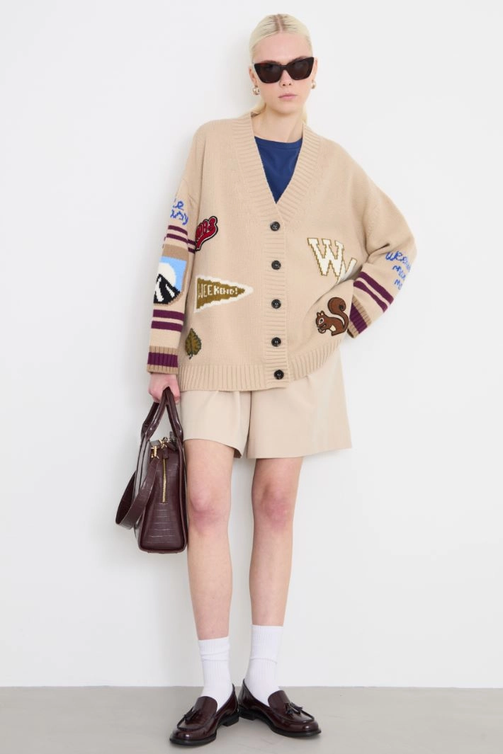Oversized cardigan in wool blend yarn with inlay, V-neck, long sleeves and button fastening.