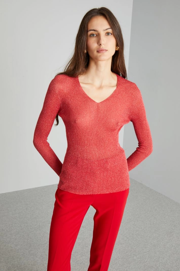 Slim-fit rib-knit viscose and lurex sweater. V-neckline and long sleeves