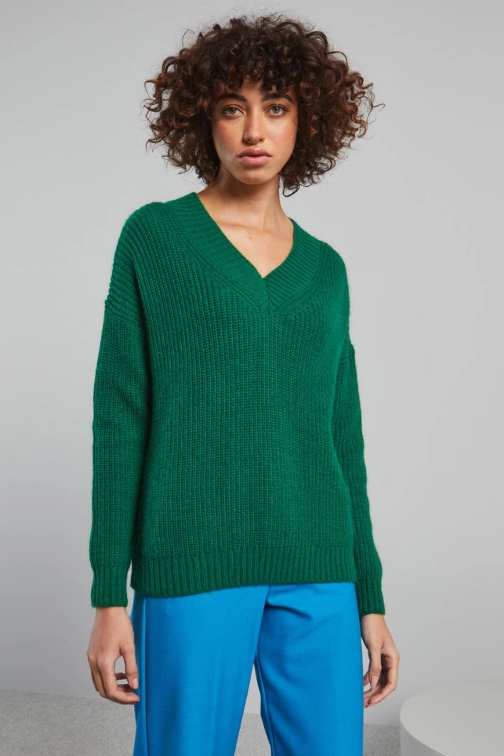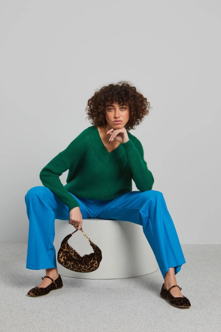 Loose fit sweater in mohair blend yarn, with ribbing, V-neck and long sleeves with dropped cuffs.