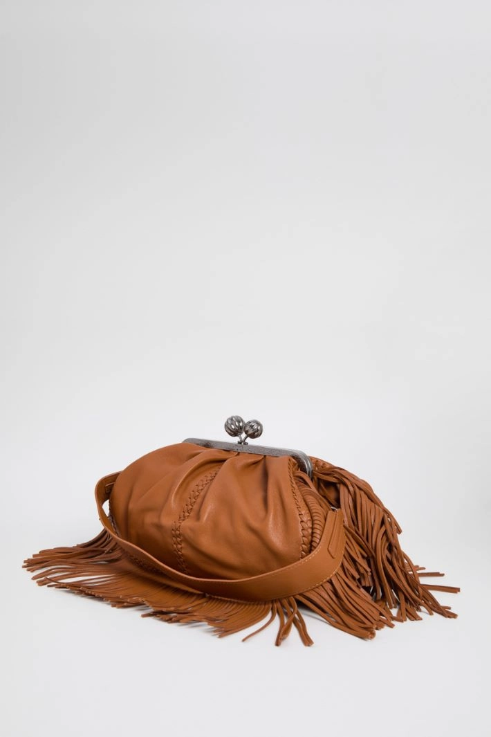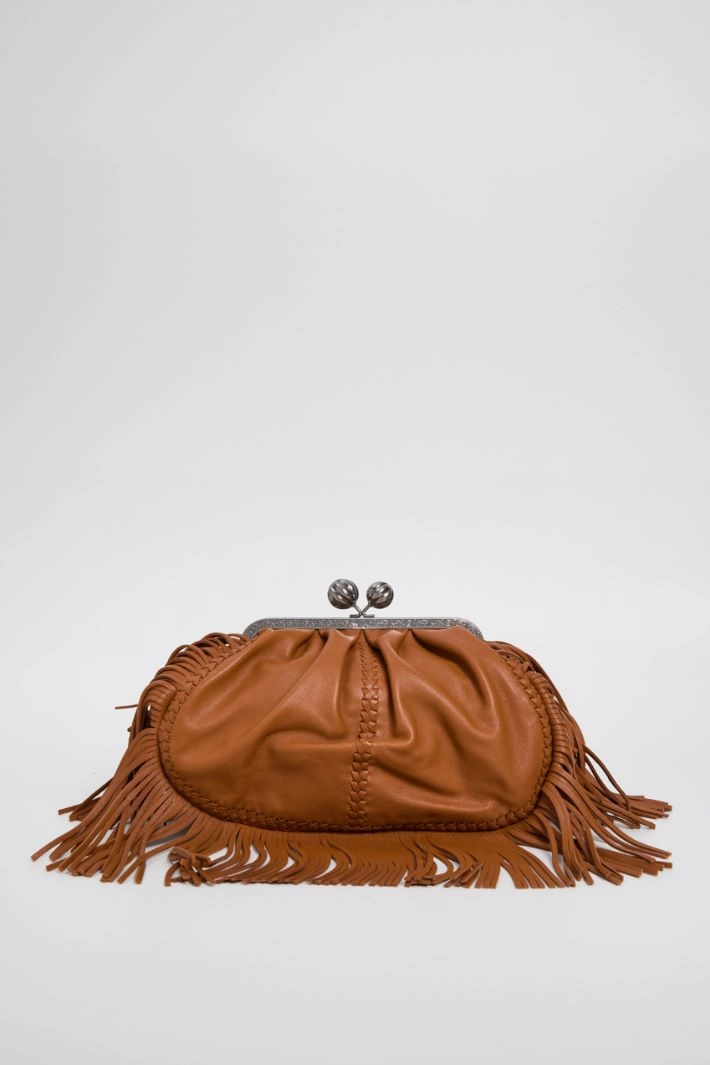 Clutch bag in genuine nappa leather with a shiny finish, with a woven pattern and fringes on the edges, two removable shoulder straps, one chain and one leather, and snap closure with carved spheres. Lined interior with pocket.