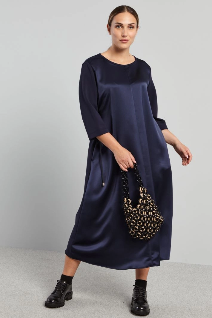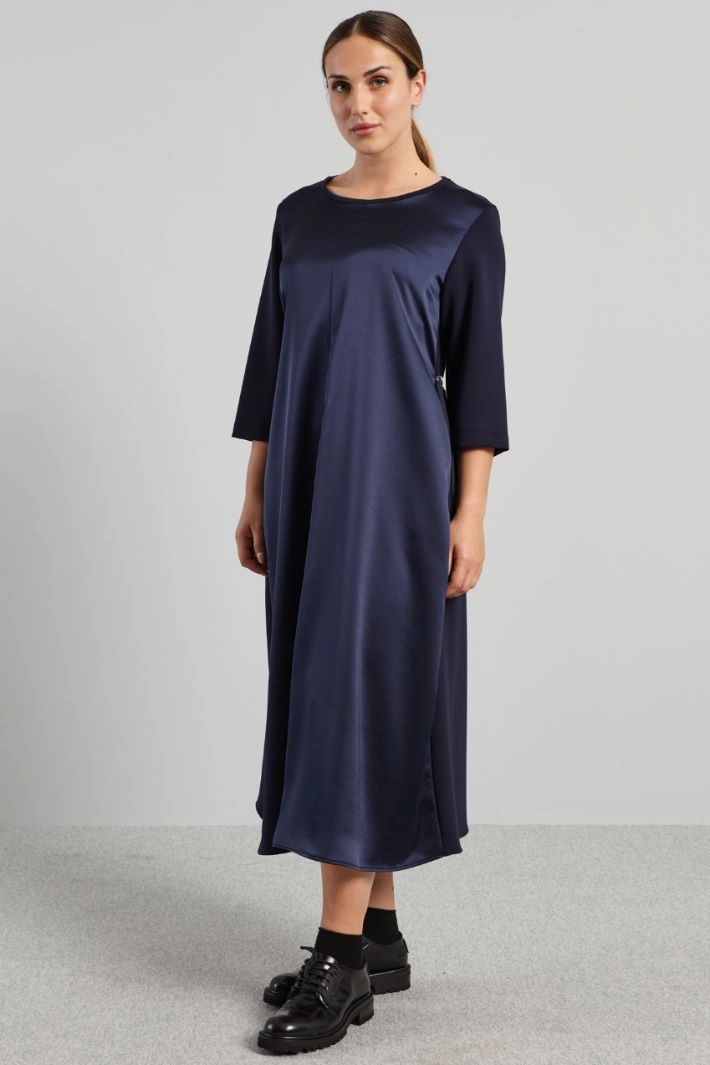 Long flared dress in heavy stretch viscose blend jersey, with satin insert on the front, round neckline, three-quarter sleeves, drawstring at the waist, inset side pockets.