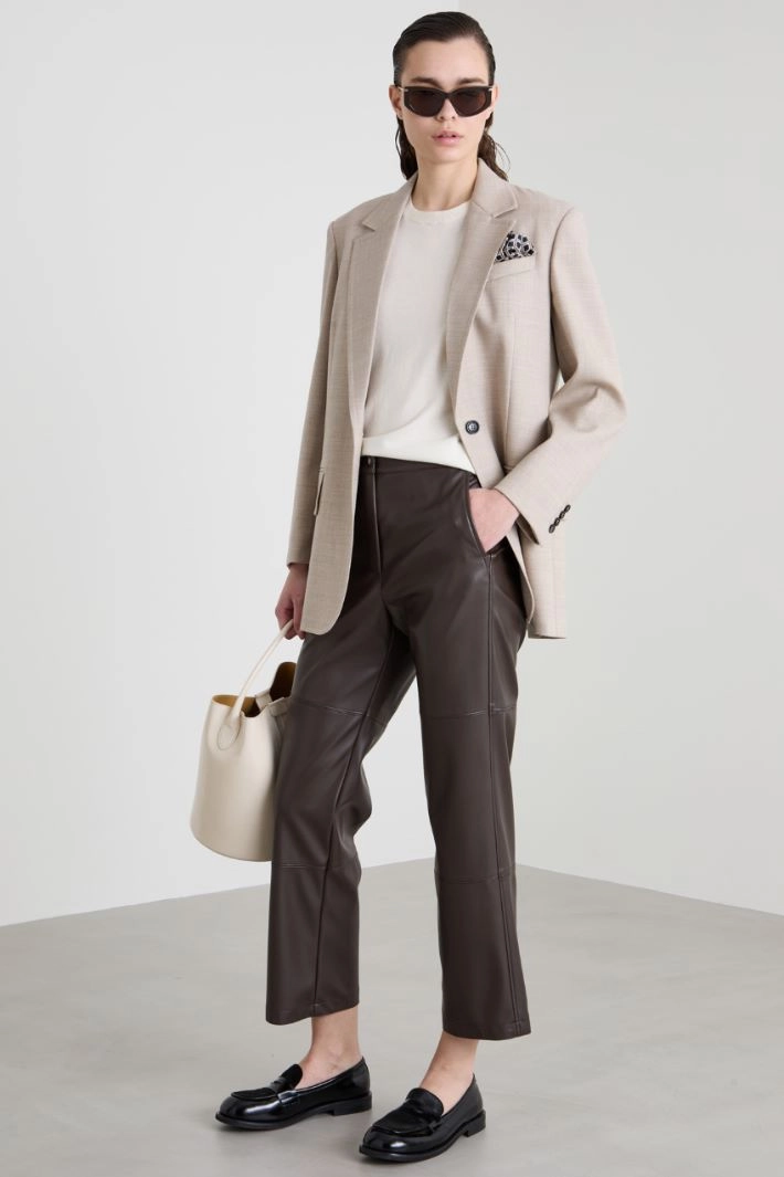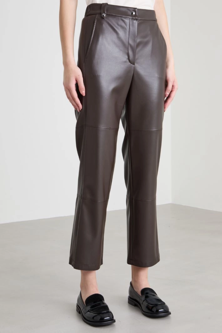 Flare trousers in faux leather coated jersey, with French side pockets, stitched seams along the leg and fastening with hidden zip and snap button.