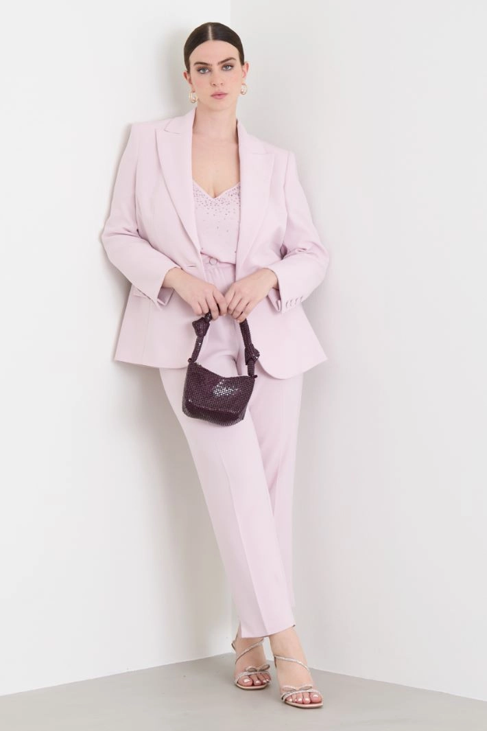 Cady cigarette trousers with elastic insert at the waist on the back, pressed crease lengthwise and side slits at the bottom of the garment. Fastening with zip and covered button.