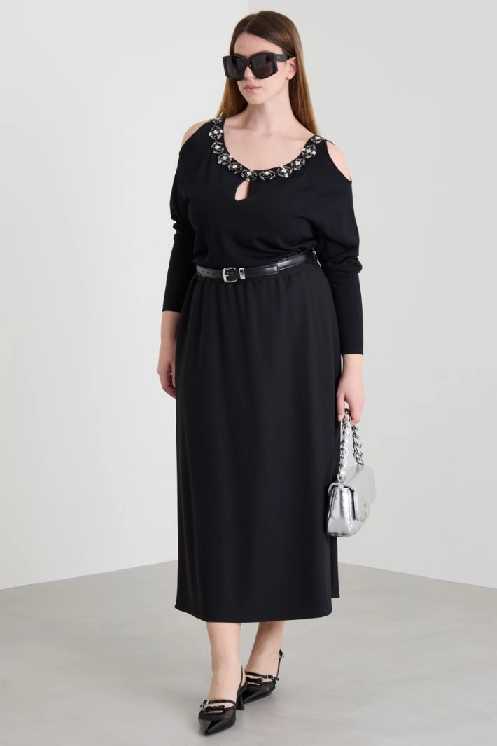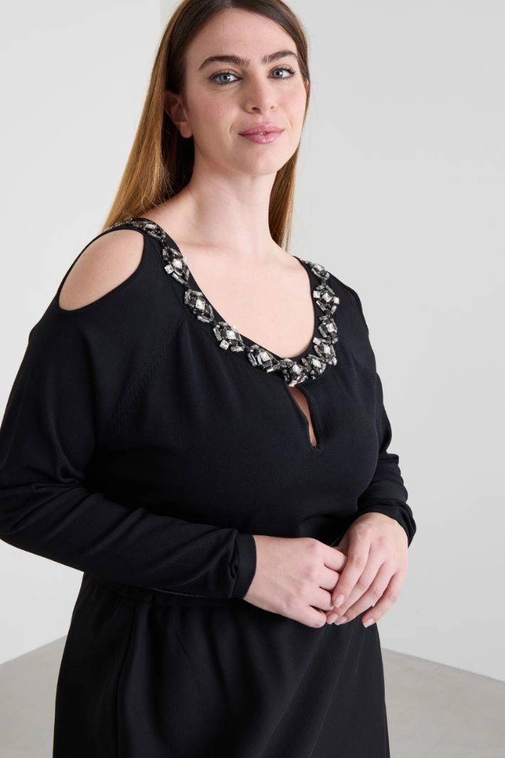 Straight-cut sweater in viscose blend yarn with embroidered stones, deep rounded neckline, opening on the shoulders and long sleeves.