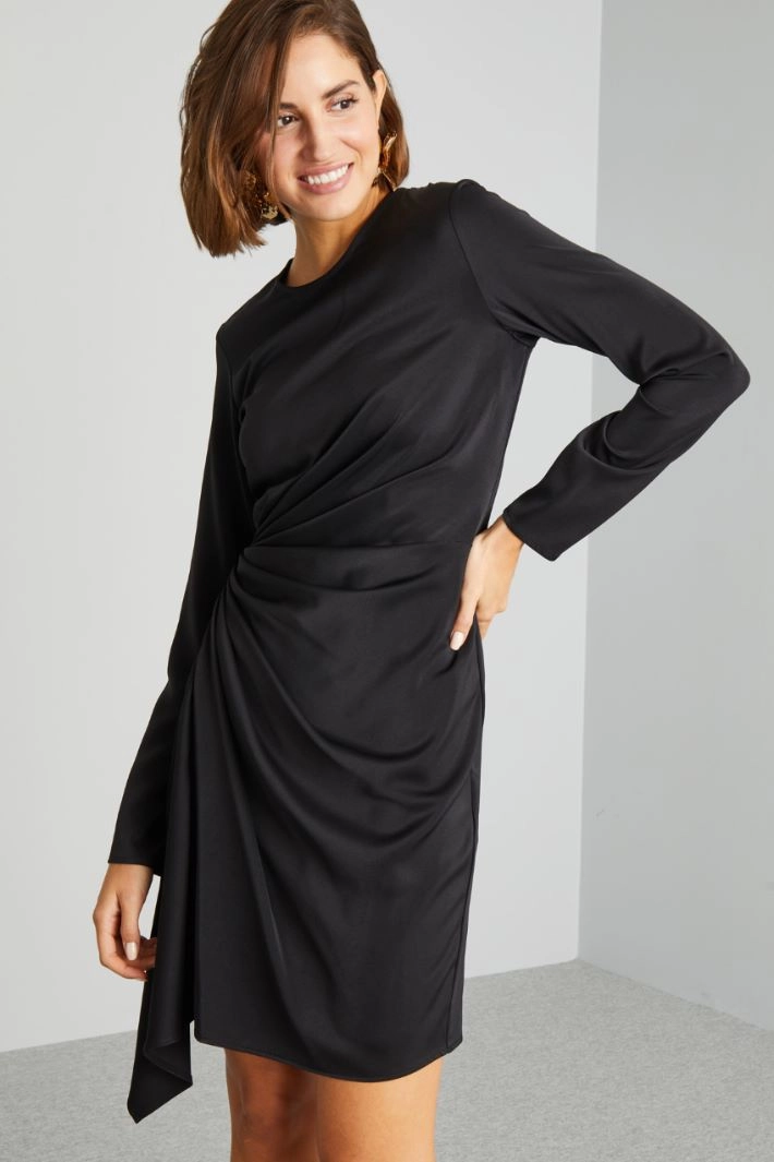 Slim fit semi-fitted satin fabric dress featuring draped side detail. Round neckline and long sleeves. Concealed zip fastening at the back.